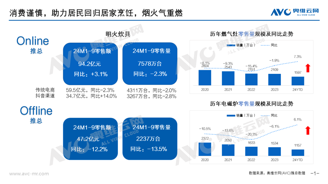 奧維云網(AVC)推總數據顯示,2024年1-9月明火炊具線上零售額94.2億元,同比增加3.1%,其中抖音渠道表現優異,同比有14%的漲幅,傳統電商略有下滑,同比降低2.3%。