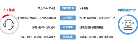 針對疫情防控工作中基層社區(qū)居民排查、快速摸清健康情況和流動情況的需求,百度推出針對疫情防控的智能外呼平臺,可提供流動人員排查、本地居民排查/回訪、特定人群通知三大場景的外呼服務(wù),能被應(yīng)用于社區(qū)情況排查和通知回訪等場景,比人工電話效率提高數(shù)百倍。