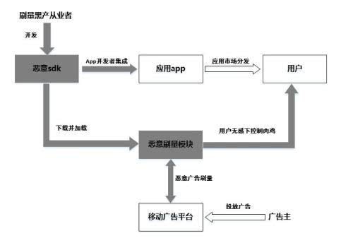 隨著近年來應(yīng)用商城安全審核的加強(qiáng),以及App簽名、加固等防護(hù)技術(shù)的成熟,通過二次打包假冒App進(jìn)行釣魚及木馬植入的攻擊手法得到了有效控制,這也導(dǎo)致越來越多的黑產(chǎn)將目光轉(zhuǎn)移到SDK。2019年,一款新型惡意SDK主要瞄準(zhǔn)各類中小型應(yīng)用,其目的是在用戶無感知的情況下通過惡意操作實(shí)現(xiàn)廣告刷量并獲利。該SDK通過將惡意子包嵌入正規(guī)移動(dòng)應(yīng)用,達(dá)成對(duì)應(yīng)用分發(fā)渠道的復(fù)用,實(shí)現(xiàn)觸達(dá)千萬級(jí)用戶的效果。