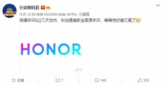 10月27日消息,數(shù)碼博主@長安數(shù)碼君今日爆料稱,榮耀手環(huán)6將于近日內(nèi)發(fā)布,有望成為首款全面屏手環(huán)。