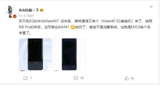 鼎橋通信近期推出了一款手機,名為N8 Pro,類似華為nova 8 Pro,搭載海思麒麟985芯片,售價3999元。現在另一款鼎橋通信手機曝光了,類似華為Mate 40手機,但后置Logo為TDTech。上周五數碼博主Ark咔嚓一下發文稱,買不到5G的華為Mate 40?沒關系,鼎橋通信又有個(Mate 40 5G套娃機)來了,按照N8 Pro的命名,這可能也叫M4?當然了,肯定不是鴻蒙系統,也就是EMUI換個名字罷了。