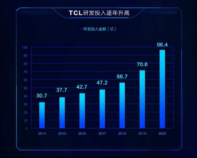領跑全球并不容易,要超越,就要比日韓企業投入的更多,布局的更早。為此TCL早在2018年就開始了布局,接著加大了技術研發投入,2020年,TCL全球研發投入超96.4億元,同比增長36.5%。2021年上半年在研發方面投入的資金有 50.9 億元,同比提升 76.9%,增速相當驚人。海量研發轉化為巨大的技術儲備,截至2021上半年,TCL專利申請總量77167件,位居中國家電企業第一。