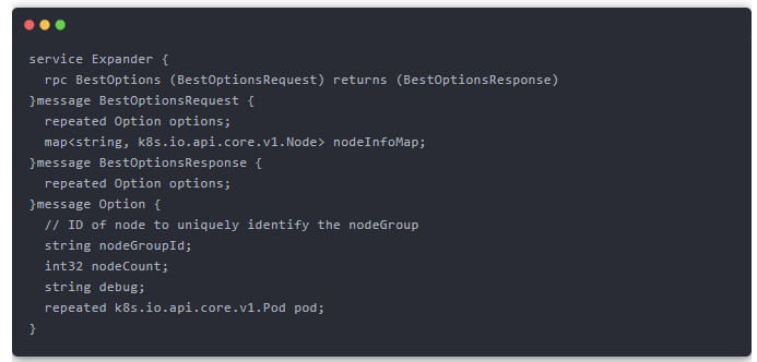 第二個組件是 gRPC 服務端,這需要由用戶實現,該服務端作為一個獨立的應用或服務運行。通過客戶端傳遞的信息以及復雜的擴展邏輯來選擇需要擴容的節點組。當前通過 gRPC 傳遞的 protobuf 消息是 Cluster Autoscaler 中傳遞給 Expander 的內容的(略微)轉換版本。