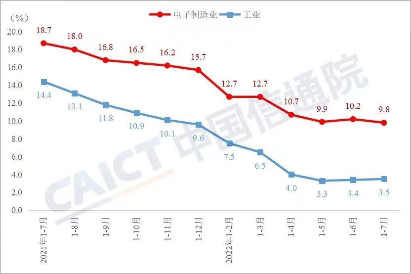 從“中國信通院CAICT”獲悉,2022年1-7月,我國電子制造業(yè)維持較快增長,行業(yè)增加值累計增長9.8%,較全國工業(yè)高6.3個百分點。其中,7月規(guī)模以上電子制造業(yè)增加值同比增長7.3%,較6月增速回落3.7個百分點。