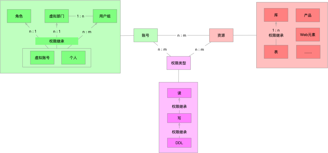 本質上,權限主要包含三個部分:賬號、資源和權限類型。相比于1.0,權限2.0對這三塊在設計上較大改變,主要體現在:
