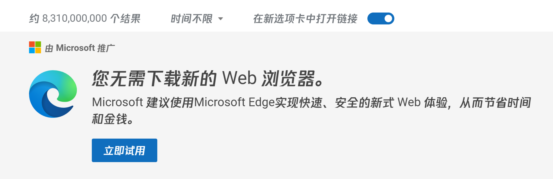 實際上,在留存和吸引用戶方面,微軟一直未停下推廣的腳步,但從用戶的角度來看,其推廣的行為多少有些“強迫性”。比如,Windows用戶會被不斷提醒安裝Edge,并將其設置為默認瀏覽器。另外,當用戶在Edge搜索Chrome,會彈出橫幅提示用戶“無需下載新的Web瀏覽器”。