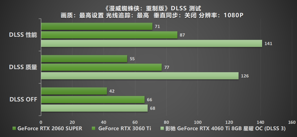 2K分辨率下的影馳 GeForce RTX 4060 Ti 8GB 星曜 OC 的成績為47幀,開啟DLSS 3質量模式后的幀數為64幀,而DLSS 3性能模式下則是擁有了超過100幀的高分。另一邊,GeForce RTX 3060 Ti 和 GeForce RTX 2060 SUPER 在DLSS 技術的加持下也能夠到流暢運行的門檻,分別為72幀和61幀。