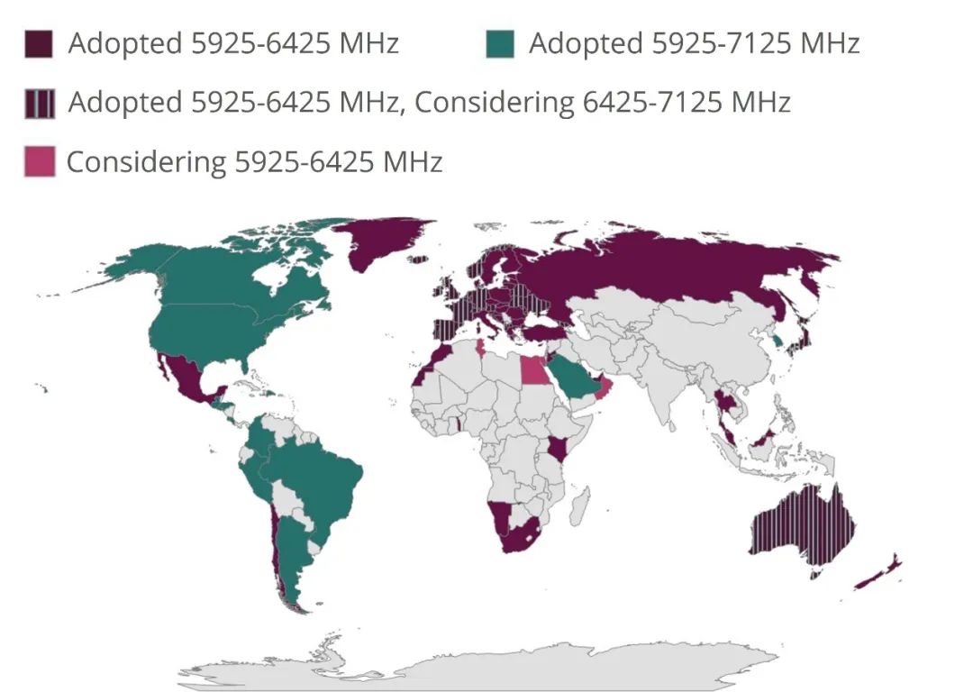 對于6GHz(5925-7125 MHz)頻段,各國表現出不同的態度,這種態度直接決定了WiFi 6E以及WiFi 7能夠充分利用6GHz頻段的命運。這些政策主要集中是否將該頻段作為非授權頻段允許WiFi接入,包括三種方案: