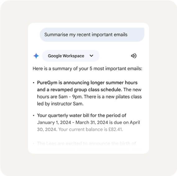 Gemini 會根據用戶提示要求,梳理摘錄近期 5 封重要的電子郵件內容,并總結每封郵件的重要內容。