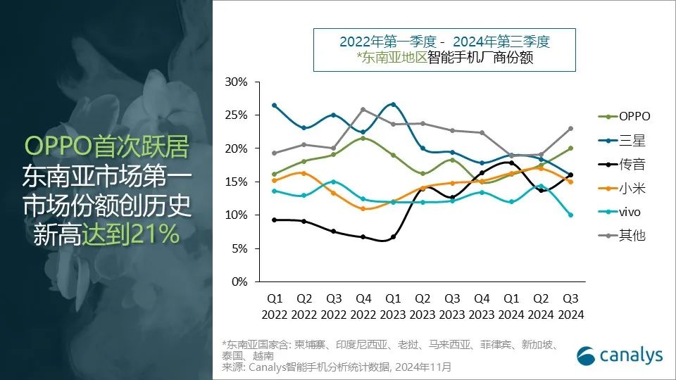 2024年第三季度,東南亞智能手機市場同比增長15%,達到2500萬臺。OPPO以 510萬部的出貨量和21%的市場份額領跑東南亞智能手機市場,這主要得益于其重塑入門級機型A3x和A3。三星緊隨其后,市場份額為16%,出貨價值份額為 23%。