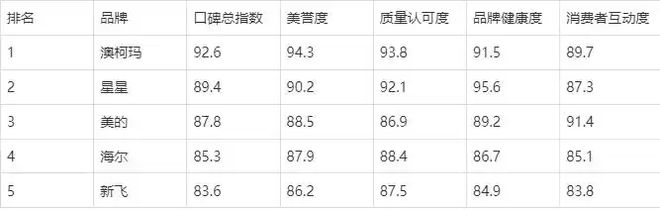報(bào)告核心維度排名數(shù)據(jù)顯示,澳柯瑪、星星、美的組成的“第一梯隊(duì)”優(yōu)勢顯著,具體表現(xiàn)如下表(品牌口碑核心維度TOP10部分?jǐn)?shù)據(jù)):
